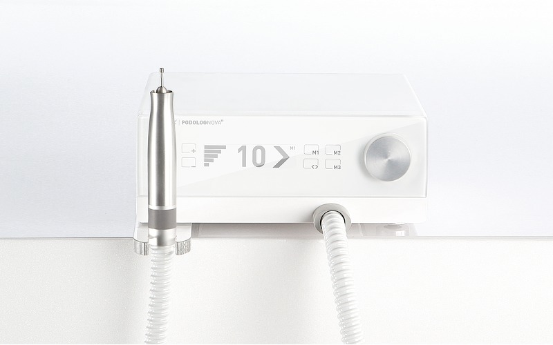 Акриловый держатель крепится за переднюю ножку корпуса педикюрного аппарата Podolog Nova 3/3s и надежно удерживает ручку мотор рядом с лицевой панелью аппарата.
