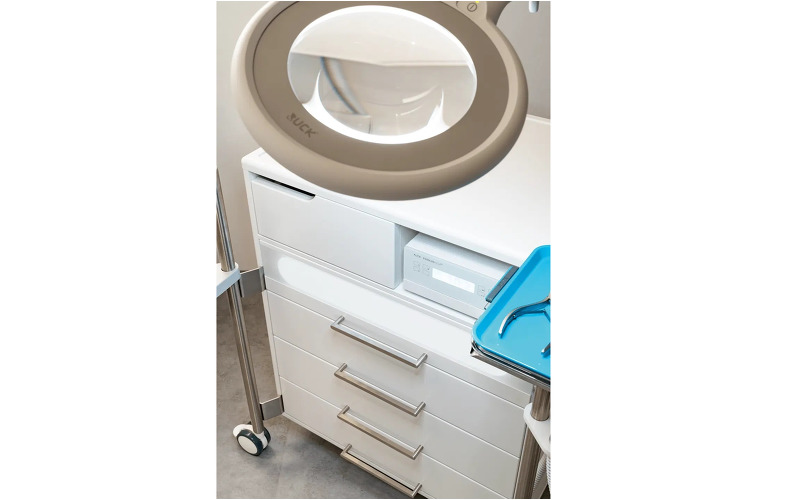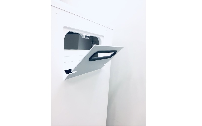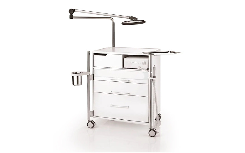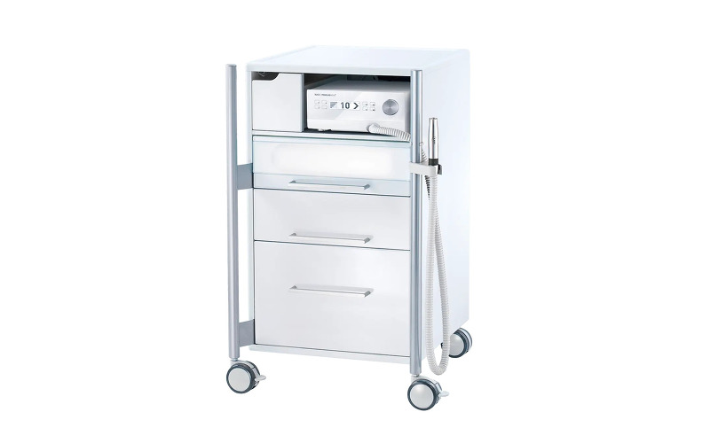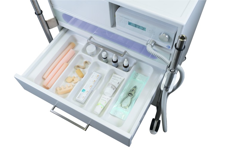 Шкаф легко и бесшумно передвигается при помощи прорезиненных роликовых колес с фиксаторами и двух функциональных стоек. На эти же стойки можно закрепить держатель для ручки и шланга педикюрного аппарата, лампу-лупу, контейнер для отходов и металлический поднос для инструментов. Вся дополнительная гарнитура может монтироваться на правую или на левую стойку – это делает шкаф одинаково удобным как для мастеров-правшей, так и для левшей. На задней панели шкафа расположена большая вентиляционная решетка для эффективного охлаждения педикюрного аппарата. Корпус шкафа и все внутренние части выполнены из ударопрочных и термостойких материалов, которые легко моются и дезинфицируются. Внешнее покрытие – резистентная плёнка из полиэстера HostaPET фирмы Hoechst, которая прекрасно зарекомендовала себя в медицинской области и отличается высокой устойчивостью к воздействию химических веществ.