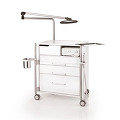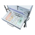 В базовой комплектации нижний ярус шкафа оснащен 3 выдвижными ящиками: двумя стандартной высоты и одним высоким, который обычно используется для хранения профессиональной косметики. Возможна комплектация шкафа четырьмя стандартными ящиками нижнего яруса. Верхний выдвижной ящик оснащен LED подсветкой. Лицевая панель ящика имеет интегрированное защитное стекло. Второй сверху выдвижной ящик может комплектоваться пластиковым органайзером для хранения инструментов (заказывается дополнительно). По желанию, остальные стандартные ящики также можно оснастить дополнительными вставками для упорядоченного хранения инструментов и аксессуаров.