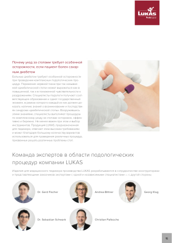Больные диабетом требуют особенной осторожности при проведении комплексных подологических про- цедур. Поражение нервной ткани при так называе- мой «диабетической стопе» может выражаться как в повышенной, так и в пониженной чувствительности к раздражениям. Специалисты-подологи получают соот- ветствующее образование и сдают государственный экзамен, в рамках которого каждый из них должен до- казать наличие знаний о возникновении и последстви- ях синдрома «диабетической стопы». Вооружившись этими знаниями, специалисты выполняют процедуры по комплексному уходу за стопами осторожно, эффек- тивно и бережно. Не менее важен при этом и выбор инструментов. Продукция LUKAS, предназначенная для педикюра, отвечает этим высоким требованиям