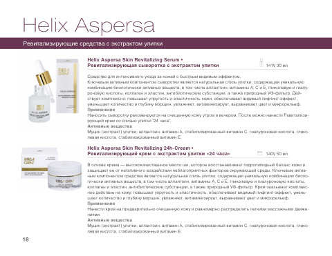 Ключевым активным компонентом сыворотки является натуральная слизь улитки, содержащая уникальную комбинацию биологически активных веществ, в том числе аллантоин, витамины А, С и Е, гликолевую и гиалу- роновую кислоты, коллаген и эластин, антибиотические субстанции, а также природный УФ-фильтр. Дей- ствует комплексно: повышает упругость и эластичность кожи, обеспечивает видимый лифтинг-эффект, уменьшает количество и глубину морщин, увлажняет, витаминизирует, выравнивает цвет и микрорельеф. Применение