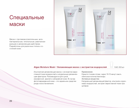 Маски с противовоспалительным, анти- бактериальным, питательным, ревитализи- рующим и увлажняющим действием. Разработаны для различных типов и со- стояний кожи.