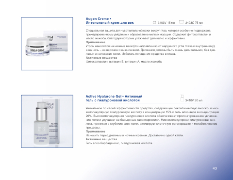 Уникальное по своей эффективности средство, содержащее рекомбинантную высоко- и низ- комолекулярную гиалуроновую кислоту в концентрации 15% и гель алоэ-вера в концентрации 20%. Высокомолекулярная гиалуроновая кислота обеспечивает пролонгированное увлажне- ние кожи и улучшает ее барьерные характеристики. Низкомолекулярная гиалуроновая кис- лота, проникая в глубокие слои кожи, активирует клеточную регенерацию и метаболические процессы.